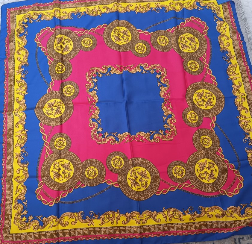 Kadın fular, ipeksi dokusu ve zincir detaylı renkli bohem desenlerle retro ve hippie tarzını yansıtıyor. Canlı renkler içerir.