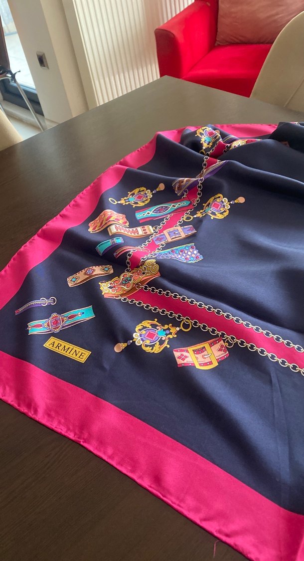 Zincir detaylı, renkli ve ipeksi dokulu Armine marka kadın eşarp. Bohem ve retro tarzlar için pop kültür ilhamlı Paris esintisi içerir. 90;90 cm
