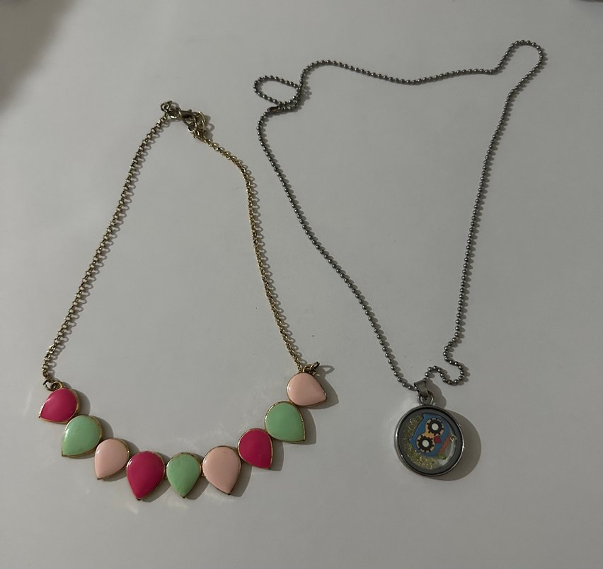 Pastel renkli desenli taşlar ve vintage tarzda kolye ucu içeren detaylı zincirli iki midi uzunlukta kadın kolyesi. Günlük kullanım için uygun,2 adet