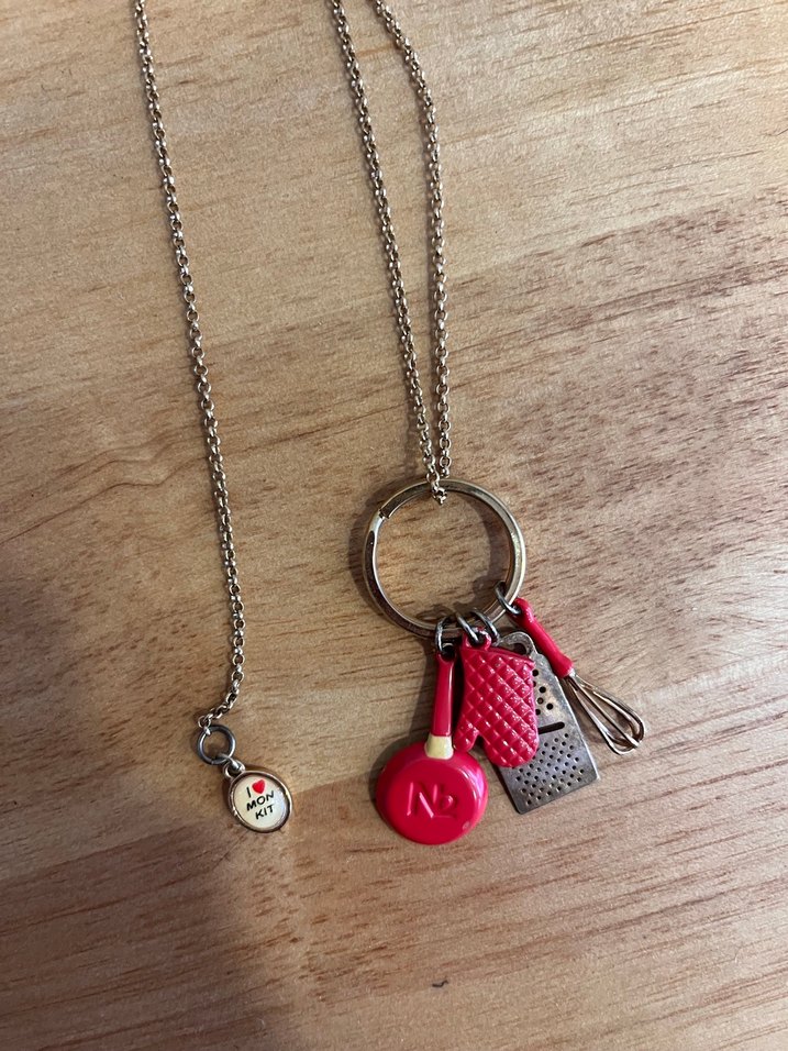 Renkli, zincir detaylı midi uzunlukta kadın kolye. Üzerinde çırpıcı, rende, fırın eldiveni ve kırmızı figürler bulunur. Günlük kullanıma uygun.
