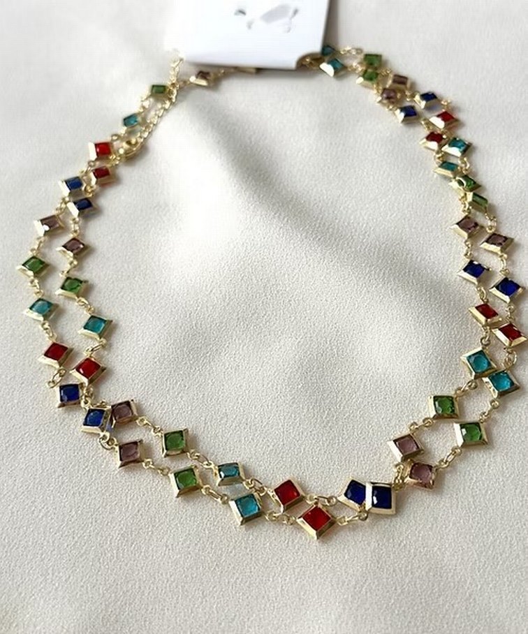Renkli kare boncuklarla detaylandırılmış uzun bohem tarzda zincir kolye, günlük kullanıma uygundur.