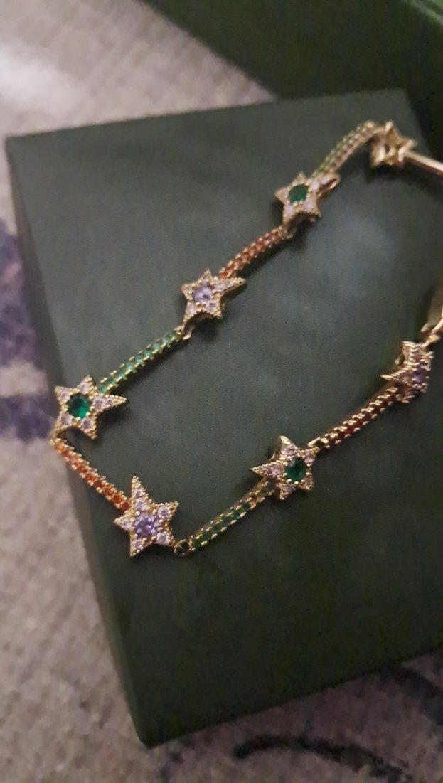 Renkli zincir ve nakış işlemeli yıldız detaylarına sahip, bohem ve gösterişli tarzı yansıtan kadın bilekliği.