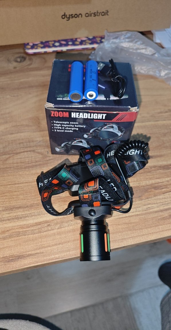 Renkli kafa lambası, zoom özellikli ve teleskopik lenslidir. Şarjlı piller ve USB kablosu ile gelir. Üç farklı aydınlatma modu bulunur.