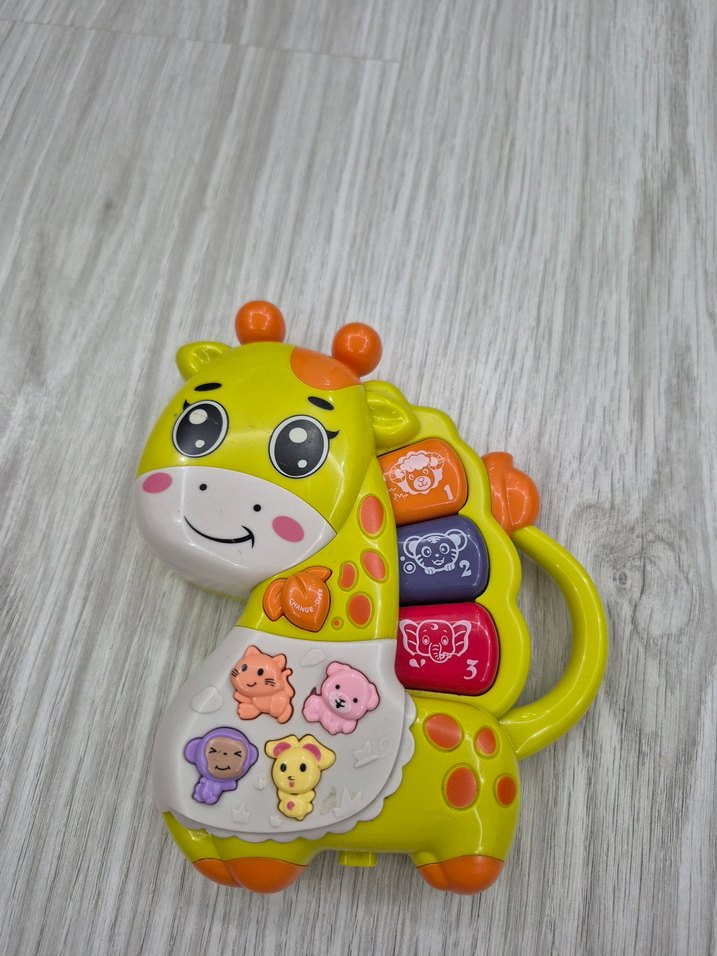 Renkli zürafa şeklinde, üzerinde hayvan figürlü ve sesli düğmeler bulunan eğitici oyuncak. Toybazz piyanolu ışıklı sesli bebek oyuncağı çalışır durumda.