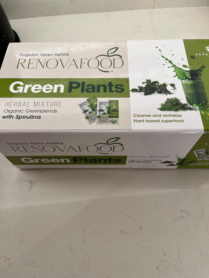 Renovafood Green Plants, spirulina içeren bitkisel karışım, organik yeşil karışımlarla temizler ve canlandırır. İçinde 28 adet vardır kereviz alerjim olduğunu öğrendiğim için kullanamadım .