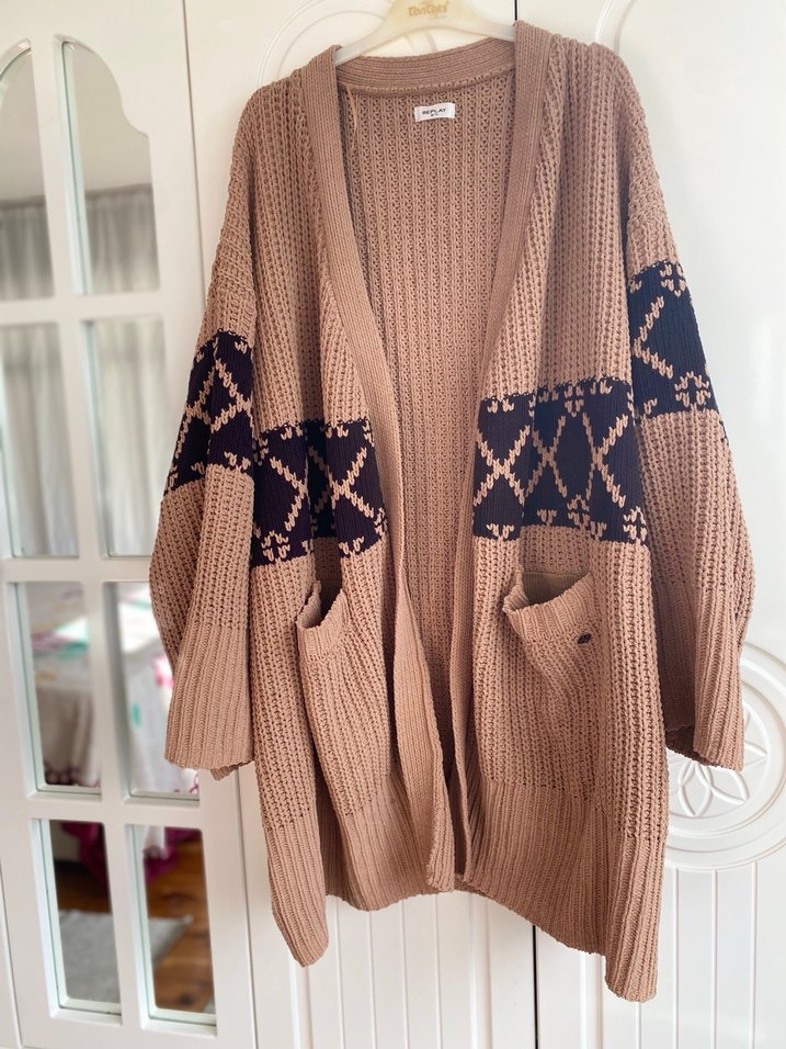 Kahverengi uzun örgü hırka, bol kesim ve desenli detaylarla. Uzun kollu ve rahat bohem tarzda, boğazlı yaka bulunur.