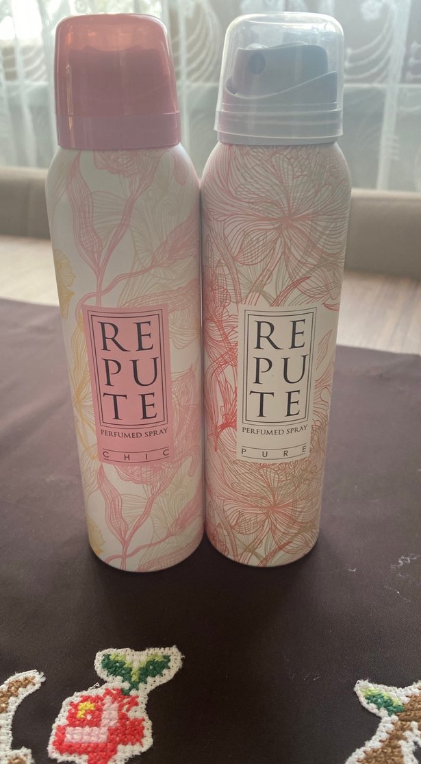 Çiçek desenli kutularda, kadınlar için iki adet Repute parfümlü deodorant spreyi, ferah kokular sunar.