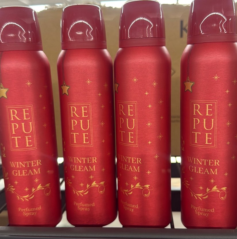Repute Winter Gleam kadın deodorant, parfümlü ve şık kırmızı şişede, özel kış kokusuyla sunulmaktadır.