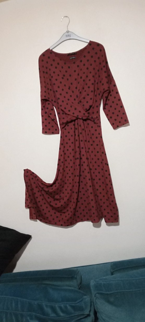 RESERVED Marka Kiremit renk, siyah puantiyeli 3/4 kol,uzun elbise yuvarlak yaka ile rahat bir kullanım sunar. Bol kesimli, yumuşak penye kumaştan yapılmıştır. Önüde ve etekleri detaylı olan kış aylarında giyilebilir şık bir üründür.Her hangi bir leke yıpranma yoktur tertemiz yeni gibi,