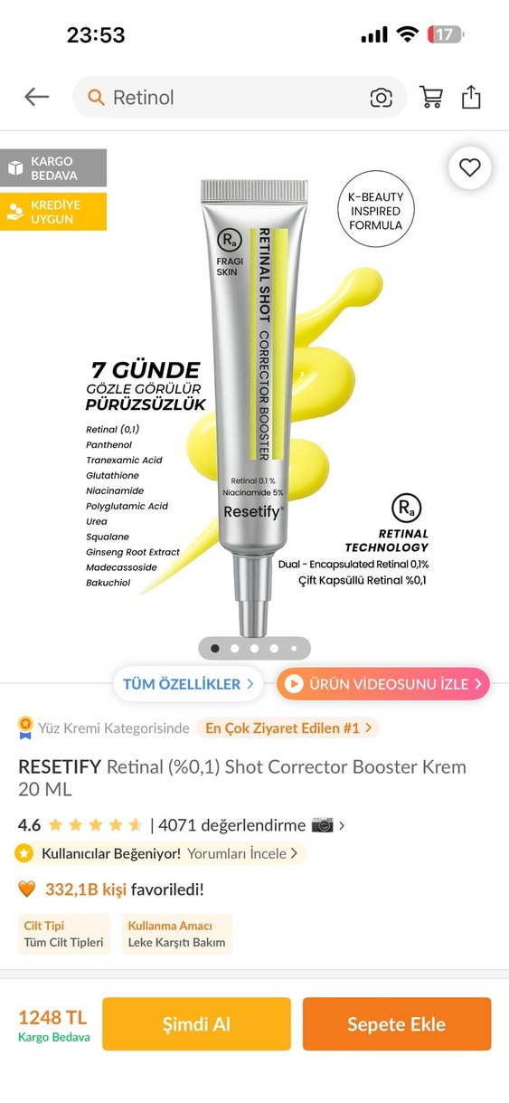 Resetify Retinal Shot Corrector Booster Krem, %0,1 retinal ve panthenol, traneksamik asit gibi içeriklerle 7 günde gözle görülür pürüzsüzlük sağlar. Çift kapsüllü retinal teknolojisi kullanır.