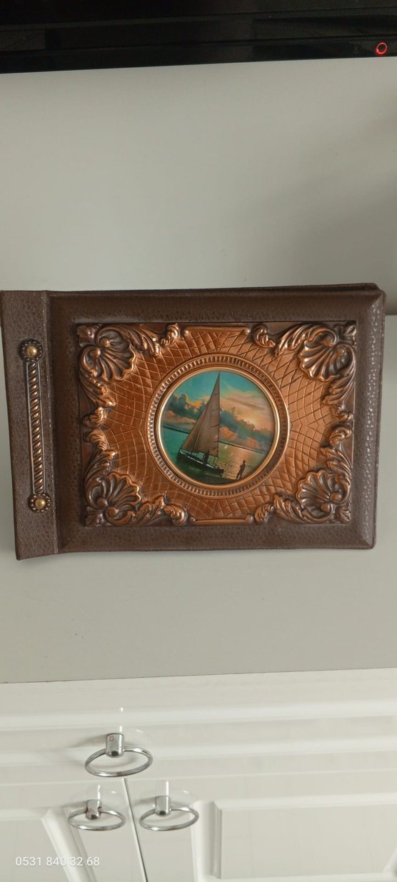 Bakır Kabartmalı kahverengi kapak üzerinde gün batımında yelkenli tekne resmi bulunan vintage tarzda sanat kitabı.