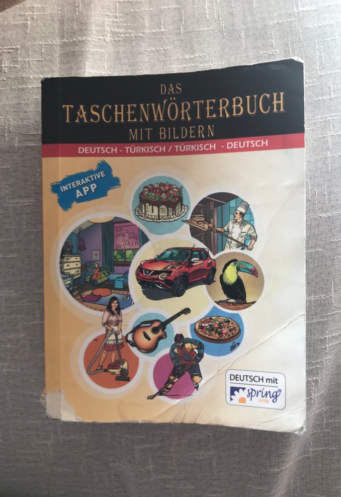 Almanca-Türkçe ve Türkçe-Almanca resimli cep sözlüğü, interaktif uygulama ile dil öğrenimini destekler.