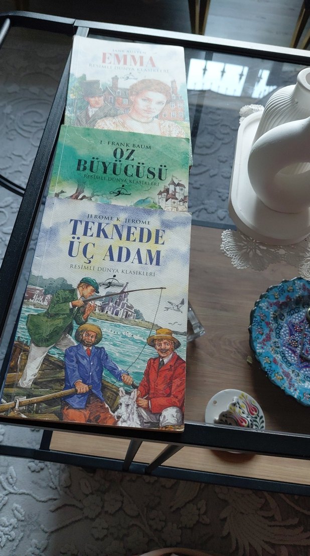 'Emma', 'Oz Büyücüsü' ve 'Teknede Üç Adam' adlı resimli klasik çocuk kitaplarından oluşan set.