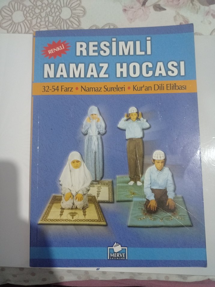 Renkli resimlerle namaz kılma aşamaları, 32-54 farz namaz, namaz sureleri ve Kur'an dili elifbası içerir.