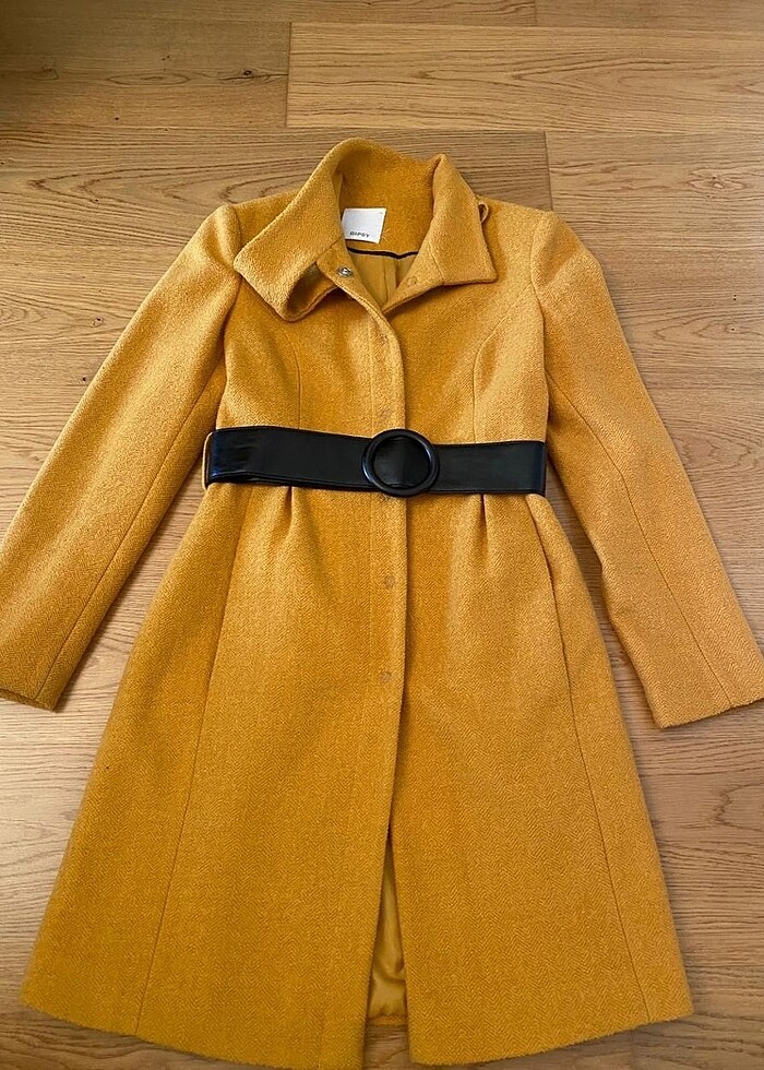 Sayılı giyilmiş olup problemi yoktur tam bir hardal renkli kemerli astarlı yaka detaylı kaban