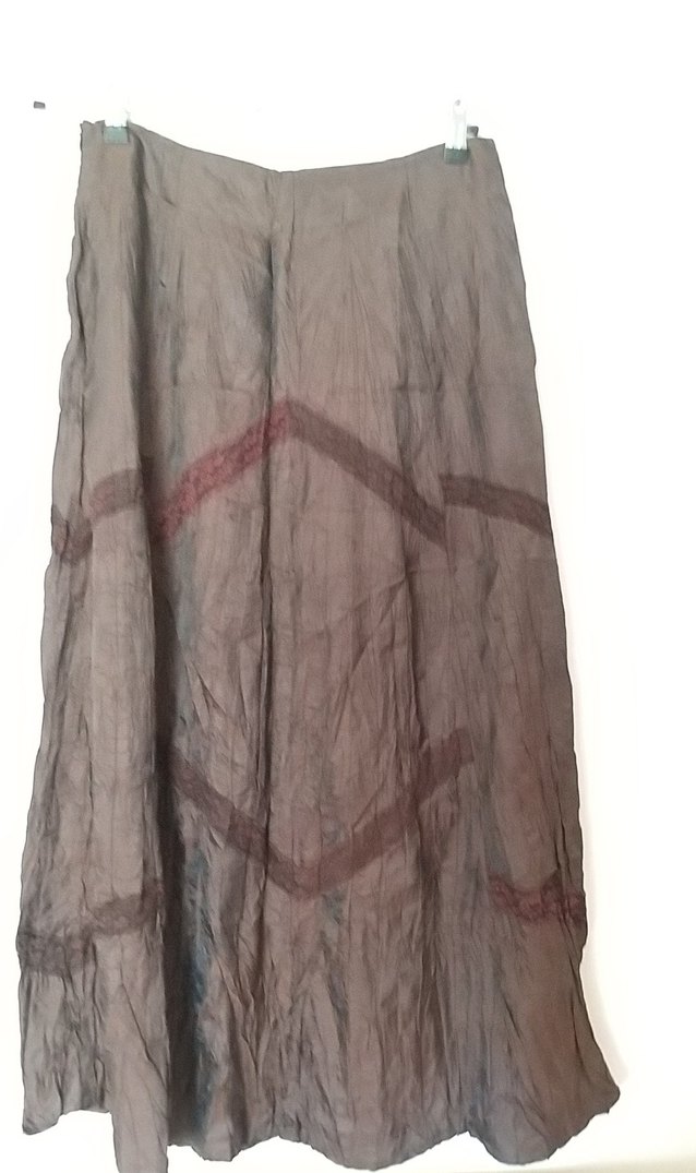 Yumuşak ince tafta dantelli rahat kesimli, uzun boyda, bohem tarzda dış mekan kullanıma uygun gri-kahve tonlarında drapeli etek. 40 bedenbel40 boy95