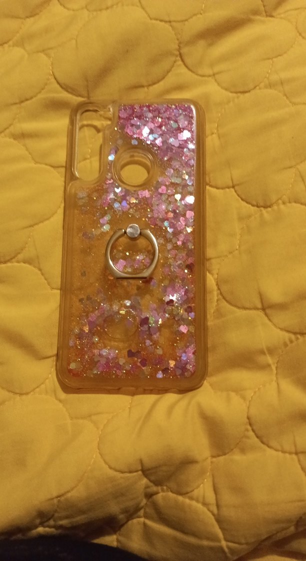 Pembe simli telefon kılıfı, kolay tutuş için halkalı ve parlak tasarımlı. Counterculture stilinde, ışıl ışıl görünür.
