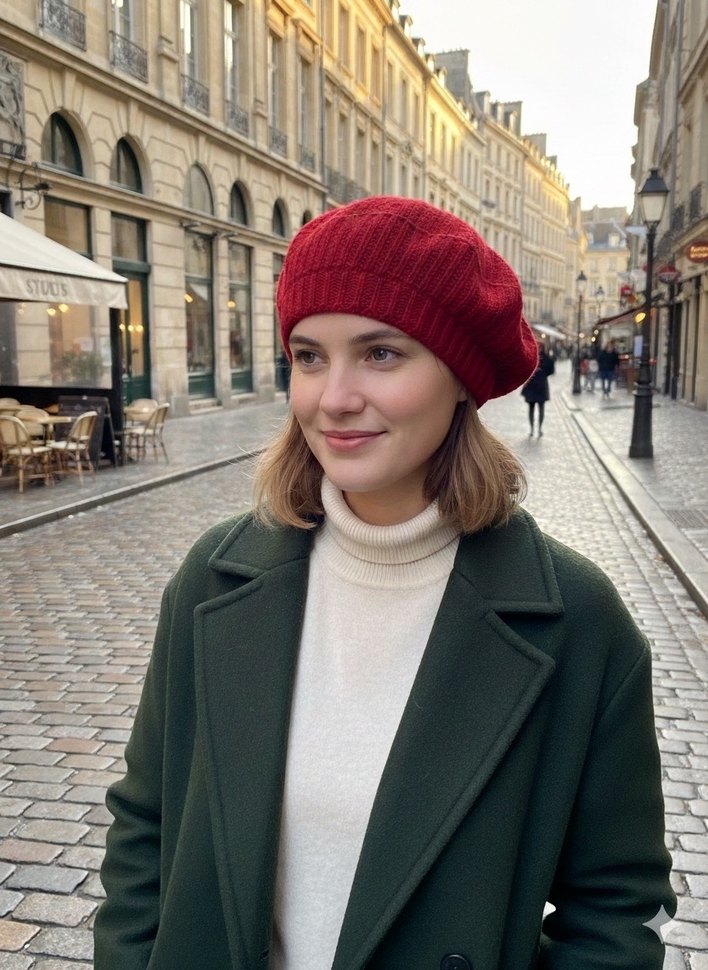 Bordo renkli örgü yün beret, Paris sokak modasına uygun trend ve rahat bir görünüm sunar. Soğuk günler için sıcak tutar.