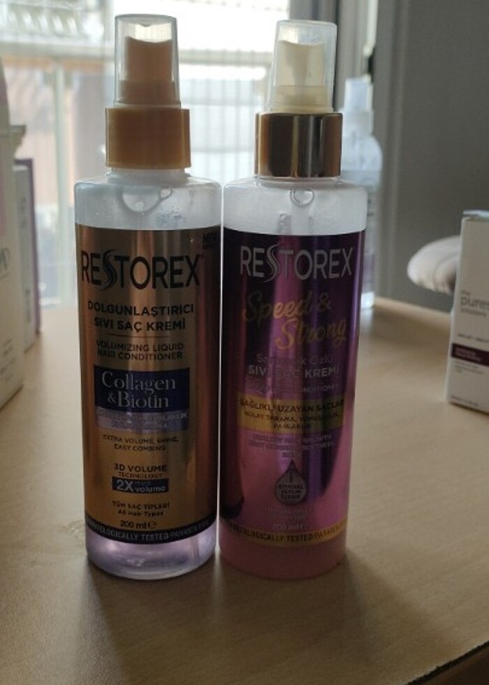 Sadece denendi yeni almıştım satmaya karar verdim ikisinin fiyatıdır restorex marka sıvı saç spreyi collagen biotin ile saç uzatır bakım yapar diğeri saç uzatmak için sarmaşık özlü spreylerdir