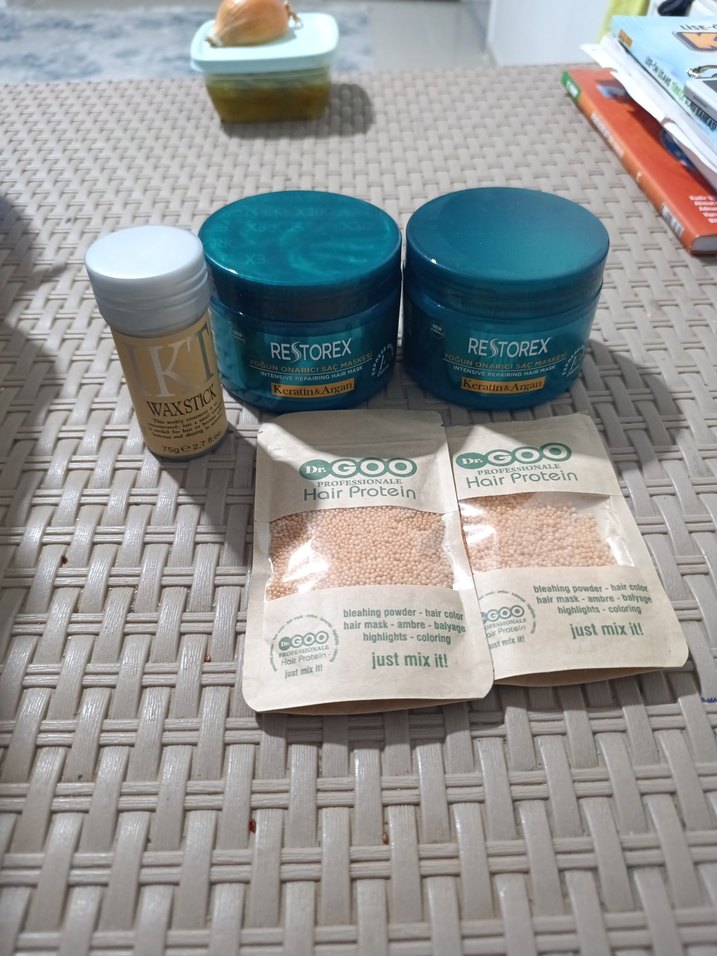 Restorex saç maskesi kavanozları, iki adet açma tozu paketi ve küçük bir saç bakım ürünü şişesi içerir. Saç bakımı ve protein tedavisi için uygun.