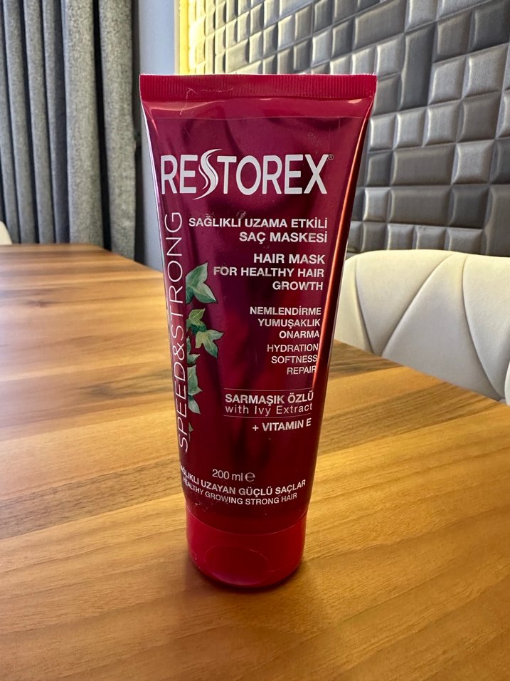 Restorex saç maskesi, sarmaşık özü ve E vitamini ile nemlendirir, yumuşatır ve onarır, sağlıklı saç uzamasını destekler.