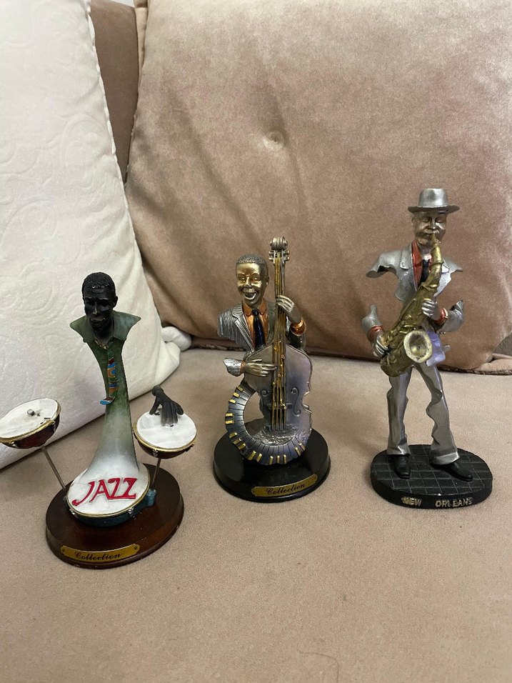 Altın renkli, koyu tonlarda caz müzisyenleri figürinleri; trompetçi, basçı ve saksofoncu figürleri içerir. Birinin kaidesinde 'JAZZ' yazısı bulunur.