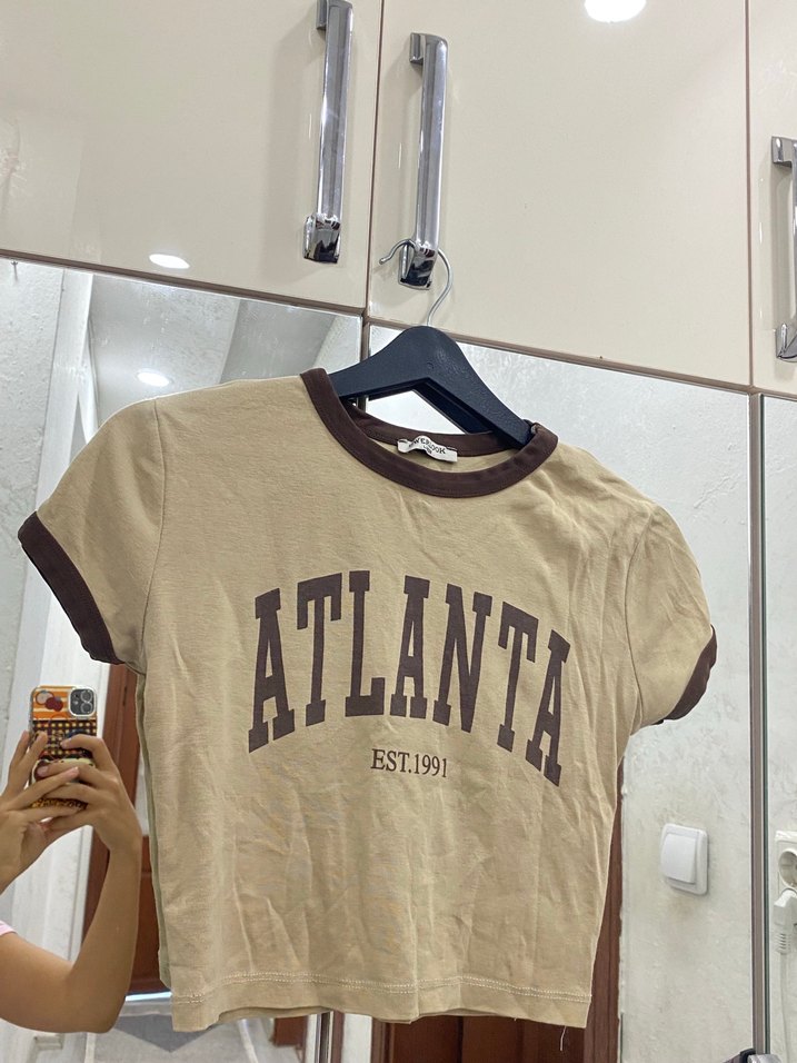 Pamuk kumaştan üretilmiş, kısa kollu ve bisiklet yaka, fitted kesim kahverengi kadın tişört. Baskısının tengi biraz soluk.