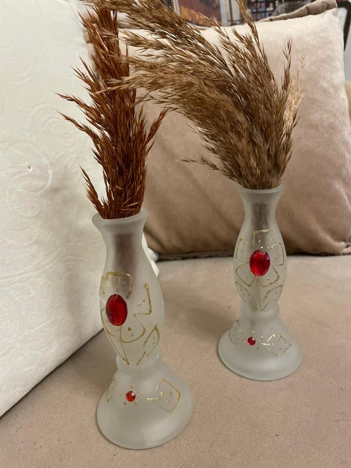 İnce beyaz vazolar, kırmızı ve altın detaylarla süslenmiş, kuru çiçekler için uygun. Hafif renk ve zarif tasarım.