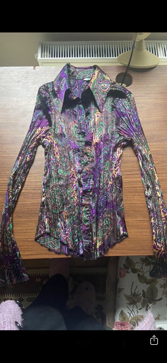 Fitted kesim, uzun kollu ve yakalı bu kadın gömleği, koyu mor tie-dye desenli piliseli yapısıyla bohem parti stiline uygundur. Sorunu yoktur esner kumaşı müthiş satensi muhteşem görüntü. Düğmeleri yok ama delikleri var kendi istediginiz gibi dikebilirsiniz