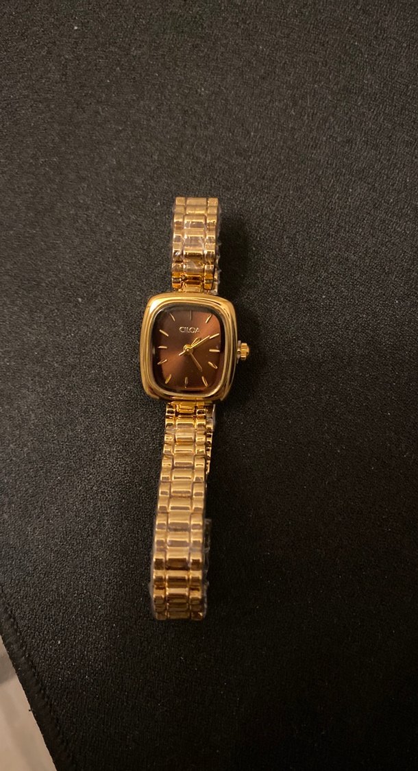 Kadınlar için parlak altın renkli kemerli kayışa ve klasik ama modern tasarıma sahip kare kadranlı kol saati. ⌚