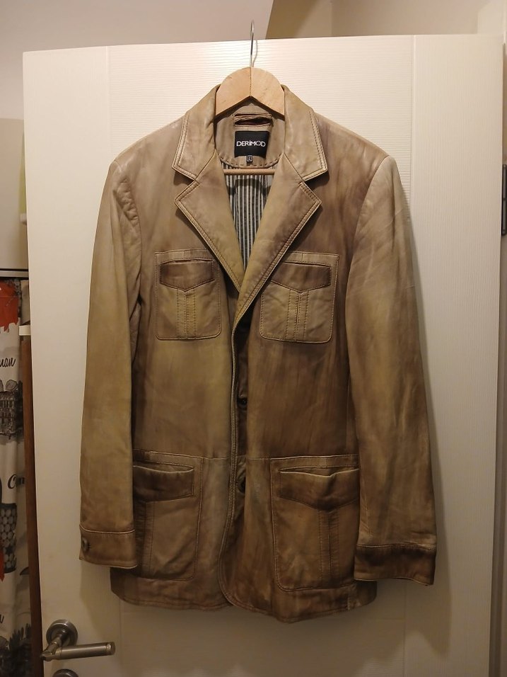 Kahverengi deri erkek ceket, düğmeli ve kesik yaka detaylıdır. Uzun kollu ve günlük kullanıma uygundur. Tadilat gören yer resimde belirtilmiştir.M ve L berdene uygundur.Temiz kullanılmıştır