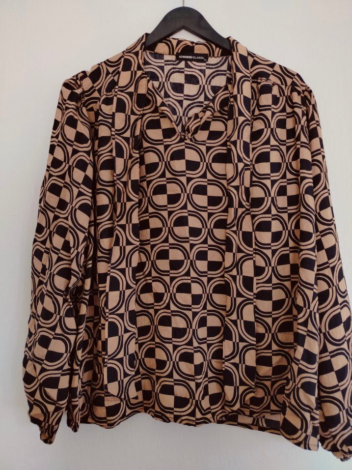 Retro desenli, uzun kollu, yüksek yakalı ve düğmeli kadın gömleği. Bol kesim ve midi boy, yumuşak sentetik kumaştan üretilmiştir.