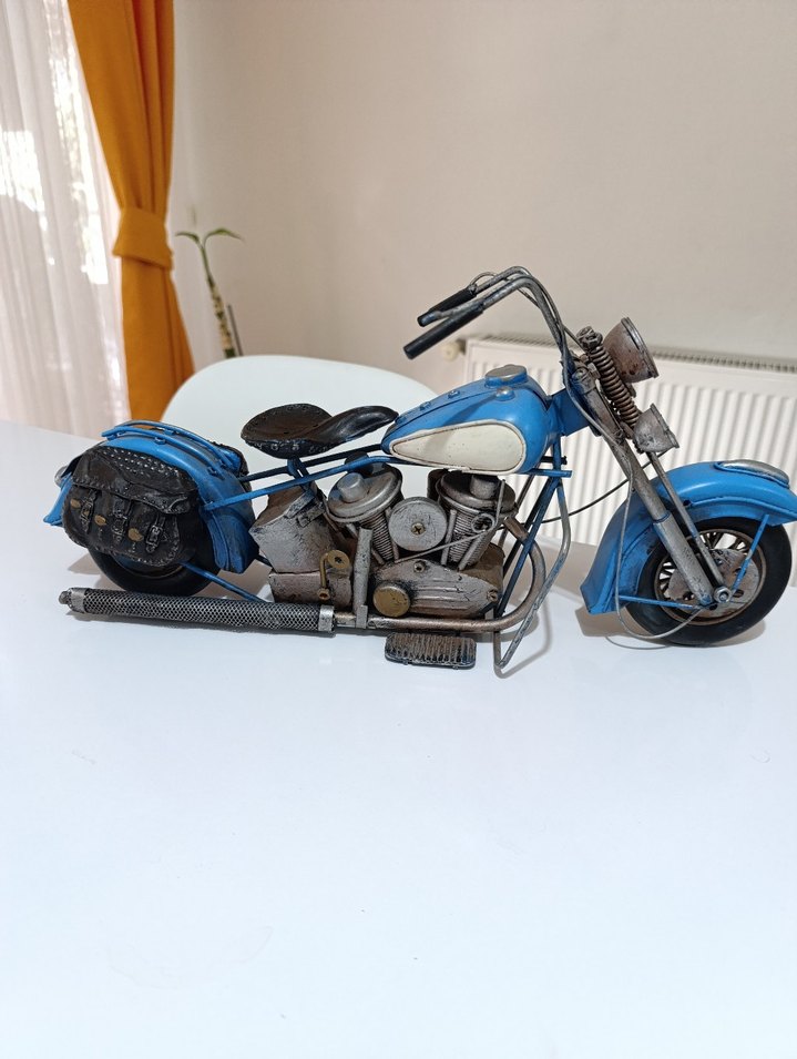 Mavi ve gri renkte, klasik, tamamı metal malzemeden oluşan el yapımıdır.