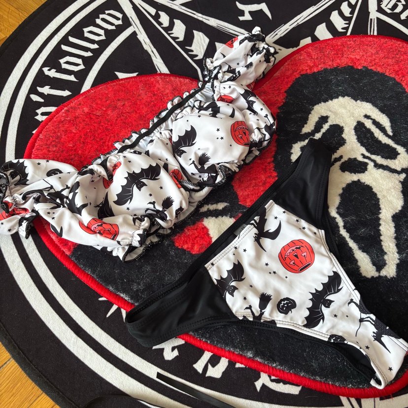 Bizarre! Retro Goth Beach Koleksiyonu Bikini Takım Üstü prenses kollu straplez olarak veya askılı kullanabilirsiniz, Altı da yüksek bellidir . S bedendir. Çok esnek ve büzgülü olduğu için m bedene kadar uyacaktır. SIFIR ürünümdür yani kullanilmamistir. Bizarre ambalaj ve etiketleri ile gelecek. Marka seçimi temsilidir. Son fiyattır