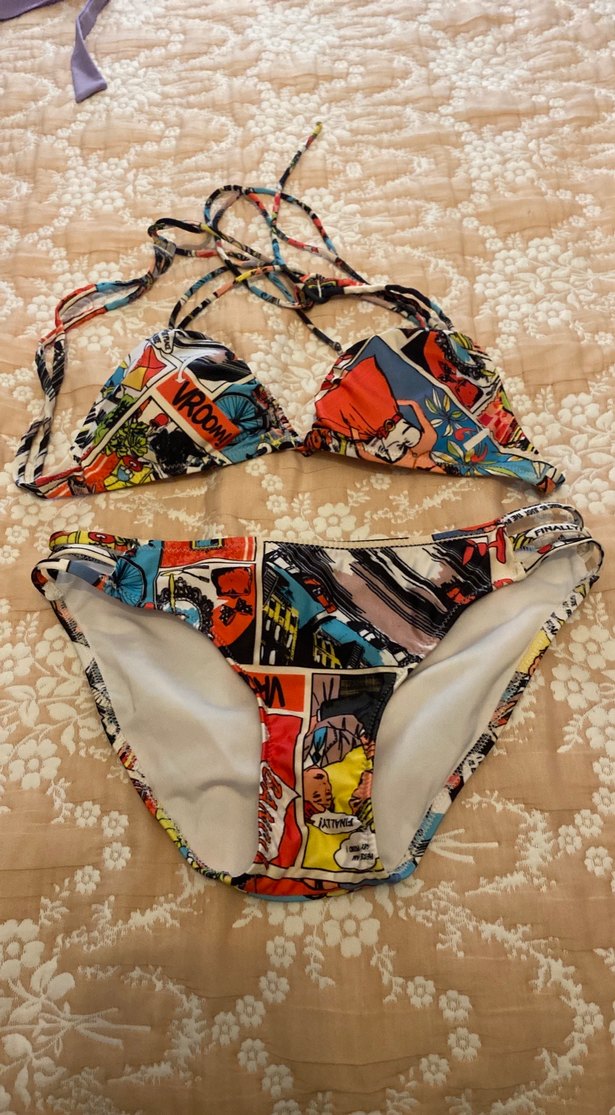 Bu dar kesim kadın bikini, koyu çok renkli pop kültür çizgi roman desenine sahip, ince askılı ve plaj için uygundur..1_2 kere giyilmiştir