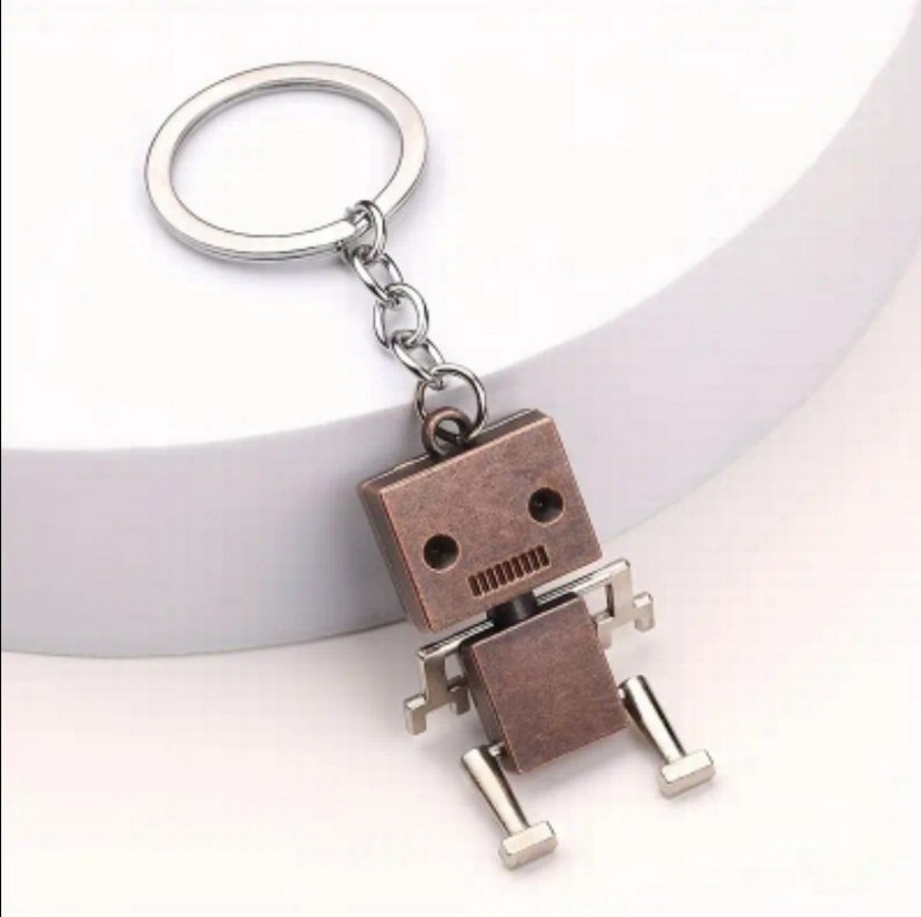 Kahverengi robot figürlü anahtarlık, minimalist ve rock punk tarzıyla dayanıklı metalden yapılmıştır, hareketli parçalara sahiptir.