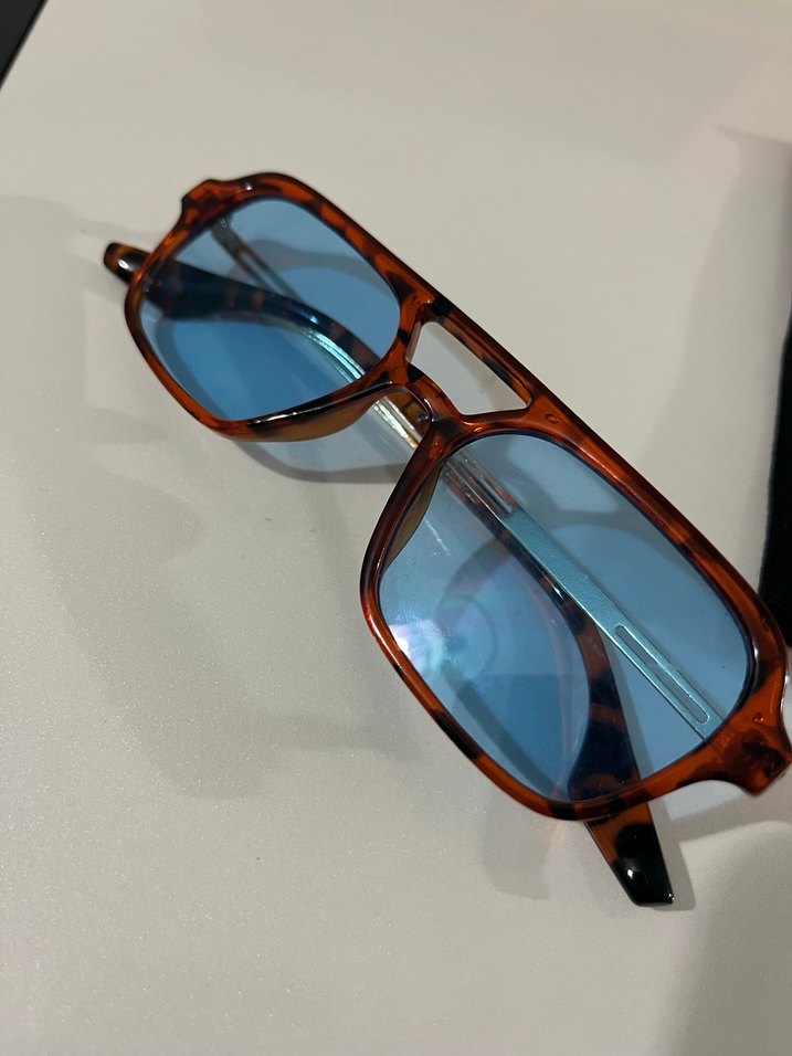 Parlak kahverengi, şeffaf çerçeveli, mavi camlı retro kadın güneş gözlüğü, bohem ve hippie tarzını yansıtıyor. ️