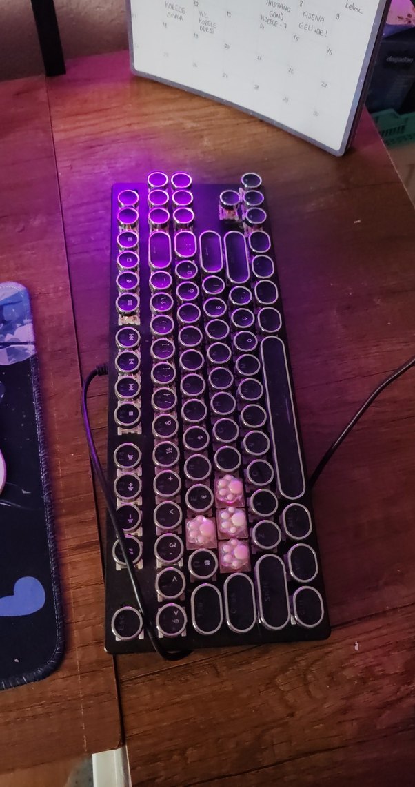 Koyu mor renkte, yuvarlak tuşlara sahip retro tasarımlı mekanik klavye. Kablolu bağlantı ile kullanılır. ⌨️ alıcı adaylarına ışıklı halini de gönderirim. herhangi bir hasarı yoktur. pati tuşlar satılık değildir. satıldığı takdirde orijinaliyle değiştirilecektir. kırmızı switch