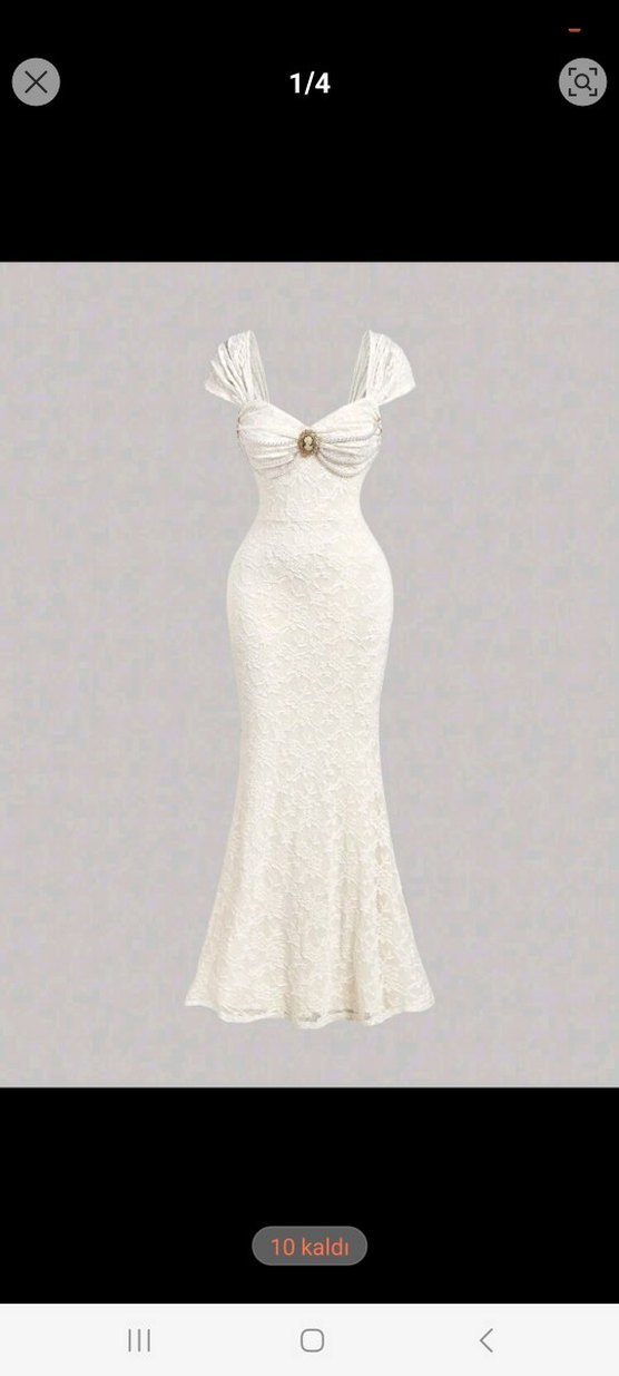 Dantel kumaştan, kolsuz ve V yakalı, balık model uzun beyaz gelinlik. Modern klasik ve vintage şıklığı bir arada sunar.