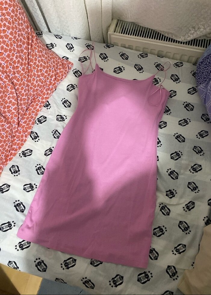 Pembe askılı, straplez yaka ve mini boyda. Düz ve pastel renkte, vücuda oturan kesim.