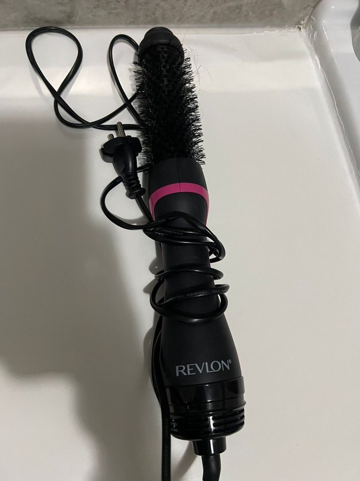 Revlon marka, pembe detaylı koyu renk saç şekillendirici fırça. Saçı kolay şekillendirmek için yuvarlak fırça başlığı bulunur.