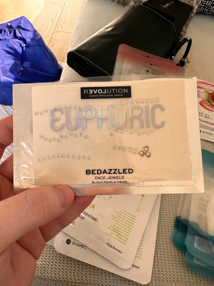 BEDAZZLED, EUPHORIC ve REVOJUTION yazılı beyaz parlak yüz takıları, cilde ışıltı katar. ✨