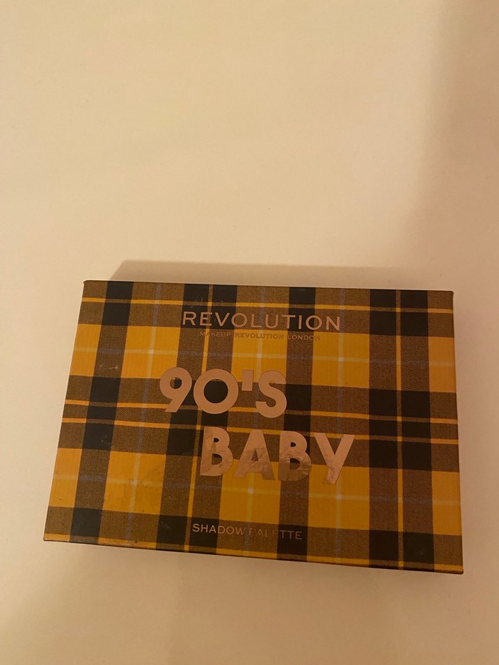 Revolution 90's Baby göz farı paleti, parlak bej ve canlı tonlar içerir. Ekose desenli kutuda sunulmuştur.