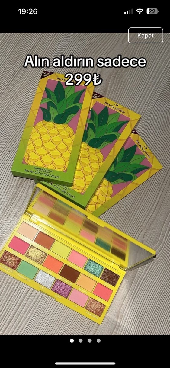 Revolution ananas temalı far paleti, sarı, pembe, yeşil ve simli tonlar içerir. Aynalı ve çeşitli renk seçenekleri sunar.