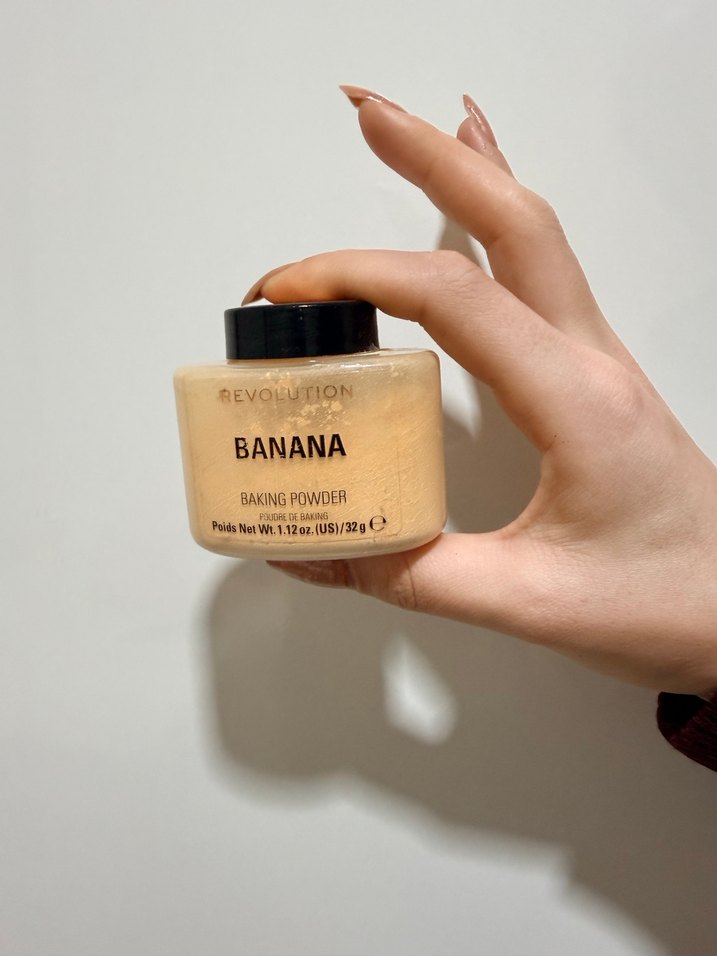Revolution markasına ait parlak bej renkli muz aromalı pişirme pudrası.