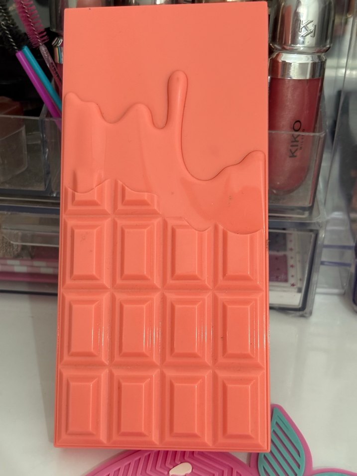 Parlak bitişli, çikolata barı tasarımlı canlı pembe göz farı paleti.