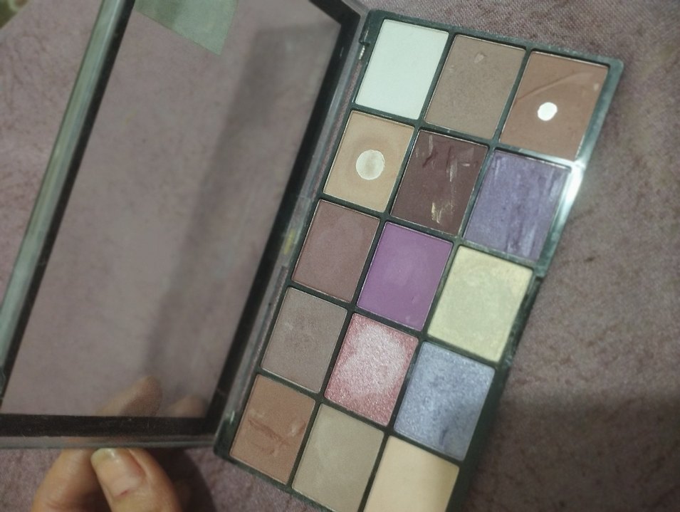 Bej ve mor tonlarında çeşitli farlar içeren, içinde ayna bulunan bir palet.
