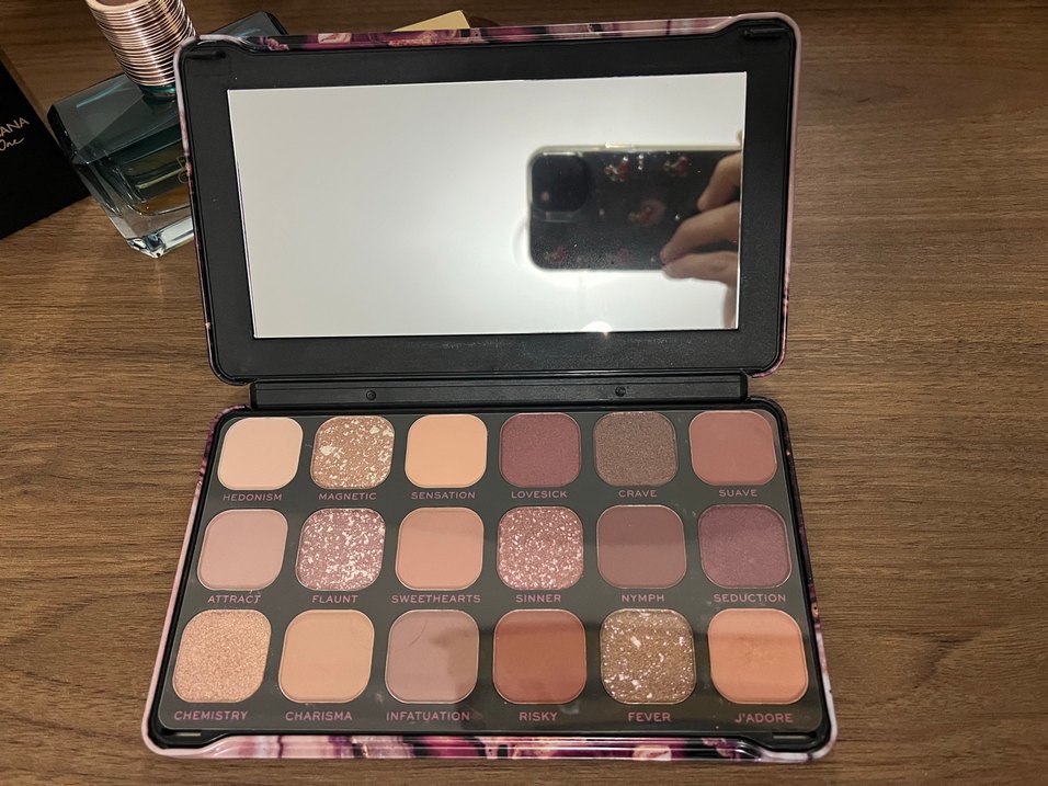 Mat ve ışıltılı bej tonlarında göz farı paleti. Risky, Infatuation, Charisma gibi isimlerle çeşitli koyu ve açık renkler içerir. Aynalıdır.