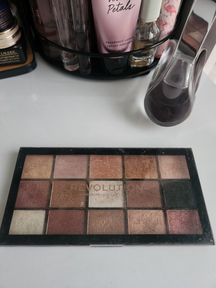 Revolution göz farı paleti, mat ve simli karışık koyu bej tonları içerir. Çeşitli göz makyajları için uygundur. Paletin üzerinde 'OLUT Petals' yazısı bulunur.