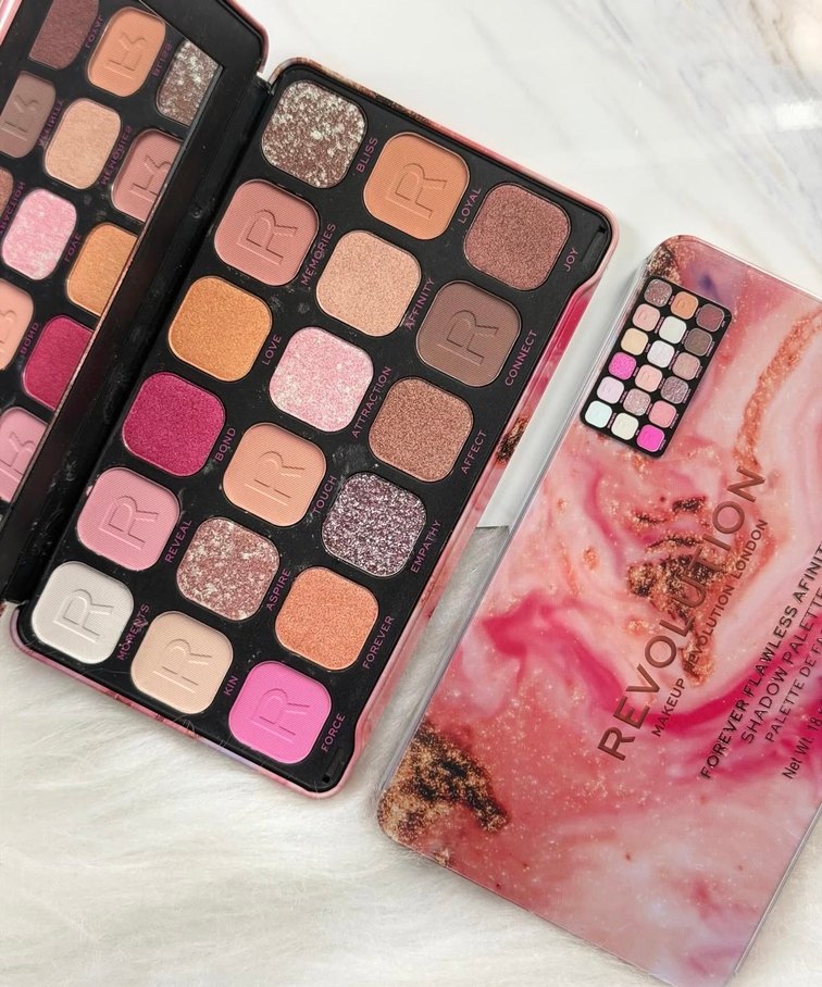 Revolution far paleti, mat ve ışıltılı bitişli açık pembe tonlarda çeşitli renkler sunar. Şık mermer desenli pembe kutuda.